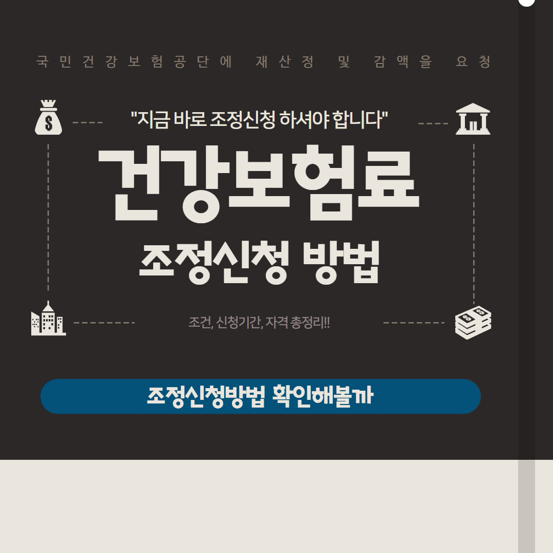 조건, 신청기간, 자격 총정리!!📉 건강보험료가 너무 높다고 느끼셨다면, 지금 바로 조정신청 하셔야 합니다. 건강보험료 조정신청하기👆 갑작스런 퇴사, 수입 감소, 휴직, 폐업 등으로 소득이 줄었는데도 건강보험료는 그대로라면? 그건 ‘조정신청’을 하지 않아서입니다. 2025년 기준, 일정 조건만 충족되면 건강보험료를 낮출 수 있는 조정제도가 운영되고 있습니다. 문제는, 이걸 아는 사람만 혜택을 본다는 거죠.지금부터 3분 안에 2025년 건강보험료 조정신청의 자격 요건, 신청 방법, 유의사항 모두 정리해드리겠습니다. 그냥 두면 몇십만 원이 그냥 빠져나갑니다.👇 아래 내용 꼭 확인하세요. 건강보험료 조정신청이란? 건강보험료 조정신청은 소득이 급감하거나 일시적으로 없는 경우,현재 책정된 건강보험..